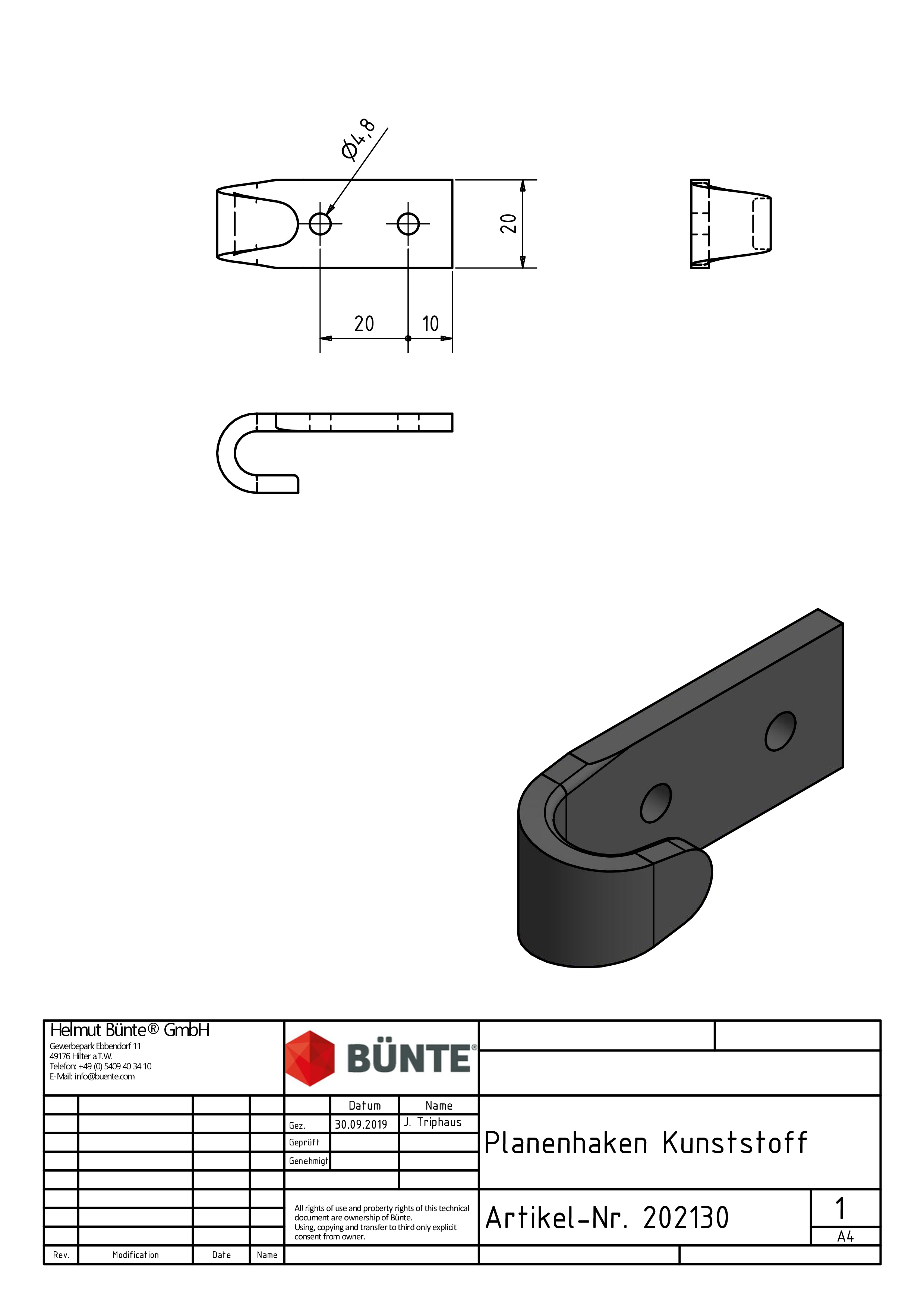 Zweiloch-Planenhaken, 20 x 63 mm, Lochabstand 20 mm, spitz, grau, Kunststoff
