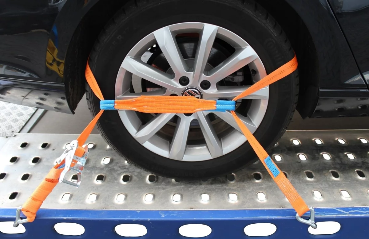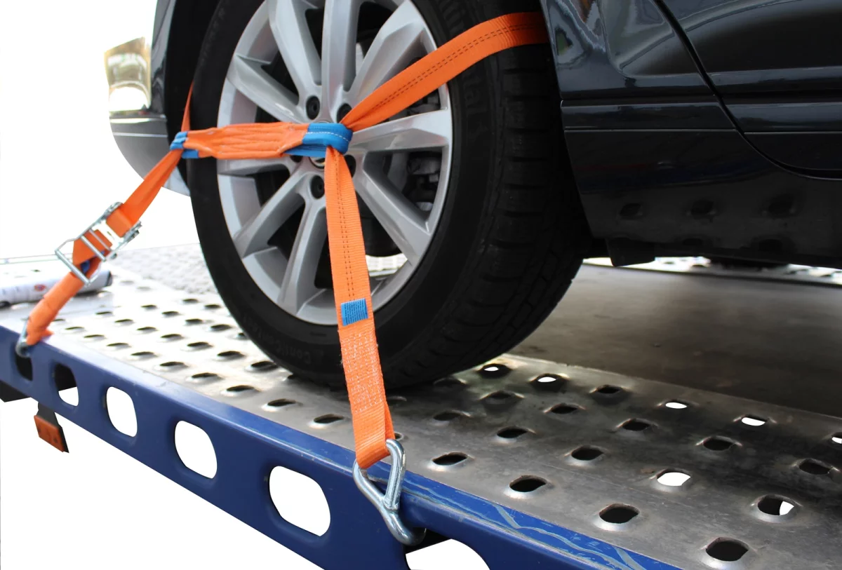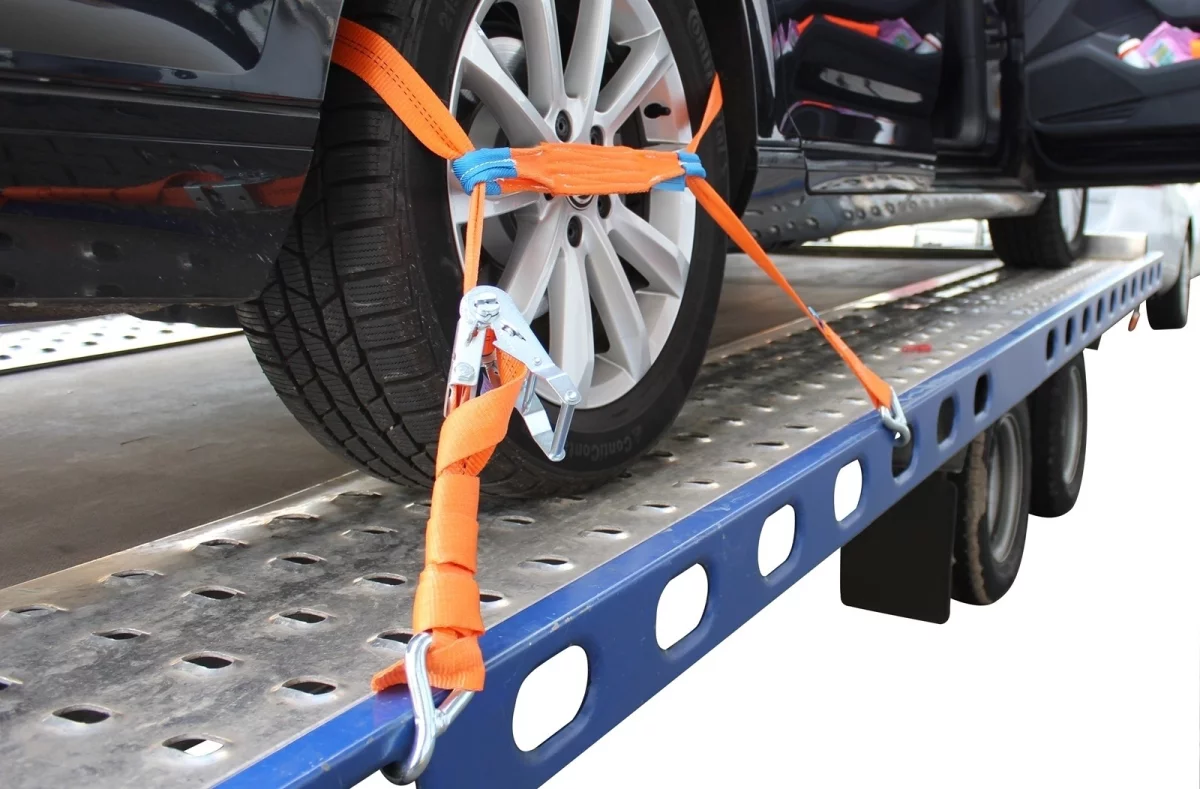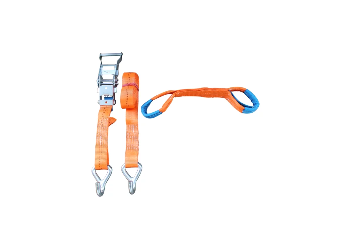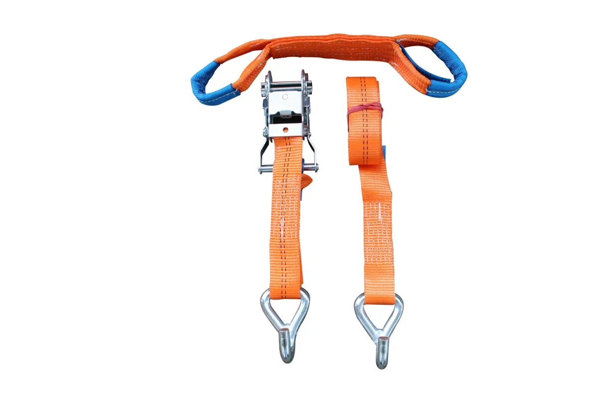 Radzurrgurt D, 35 mm x 2,5 m, 1000/2000 daN, orange, 3-teilig, Losende 2,3 m, Festende 0,21 m, Verbindungsgurtband 50 mm x 0,37 m mit beidseitigen Schlaufen 2000 daN, mit Ratsche, Spitzhaken einfach