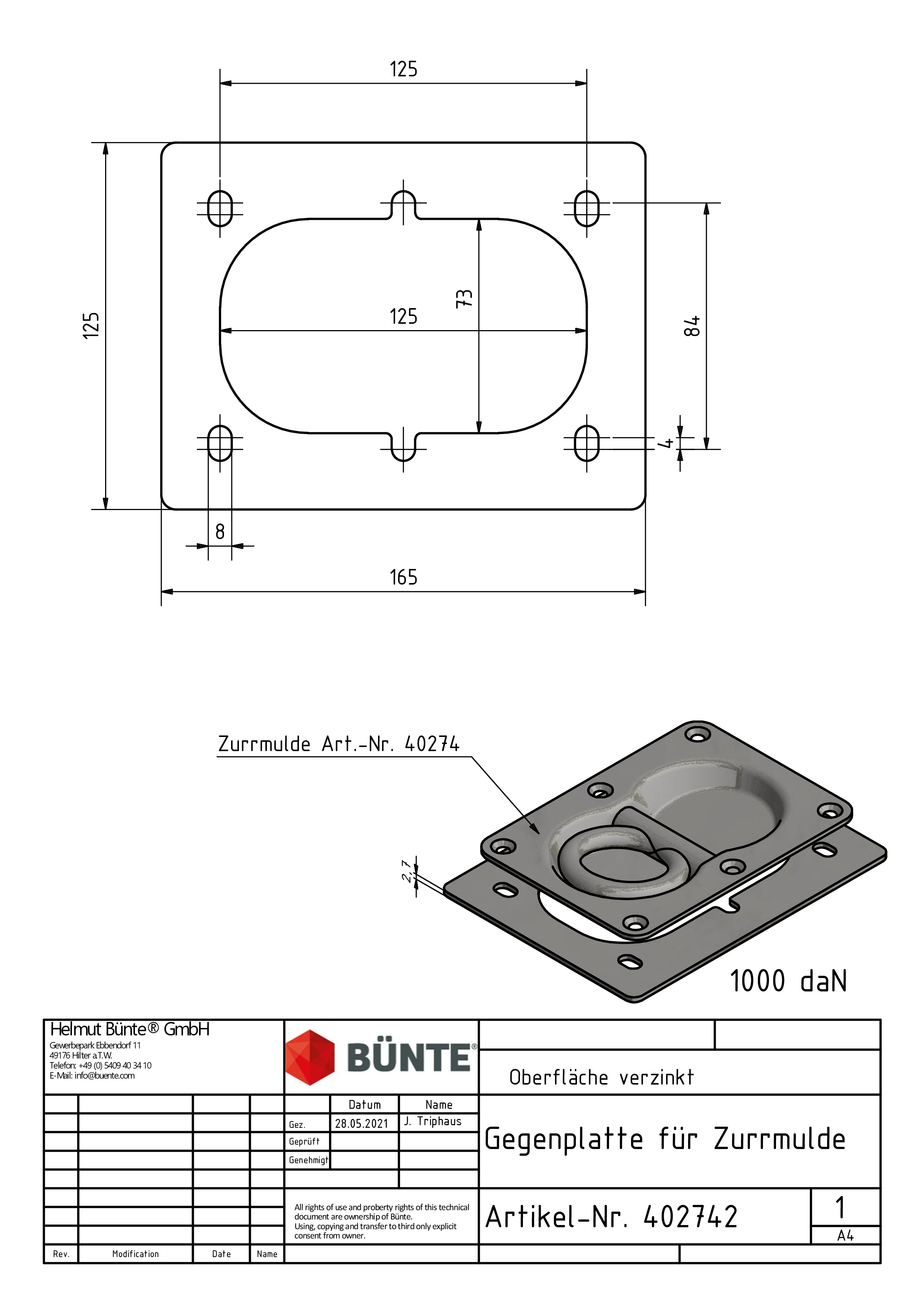 Gegenplatte, 125 x 165 mm, für Zurrmulde 40274, Stahl verzinkt