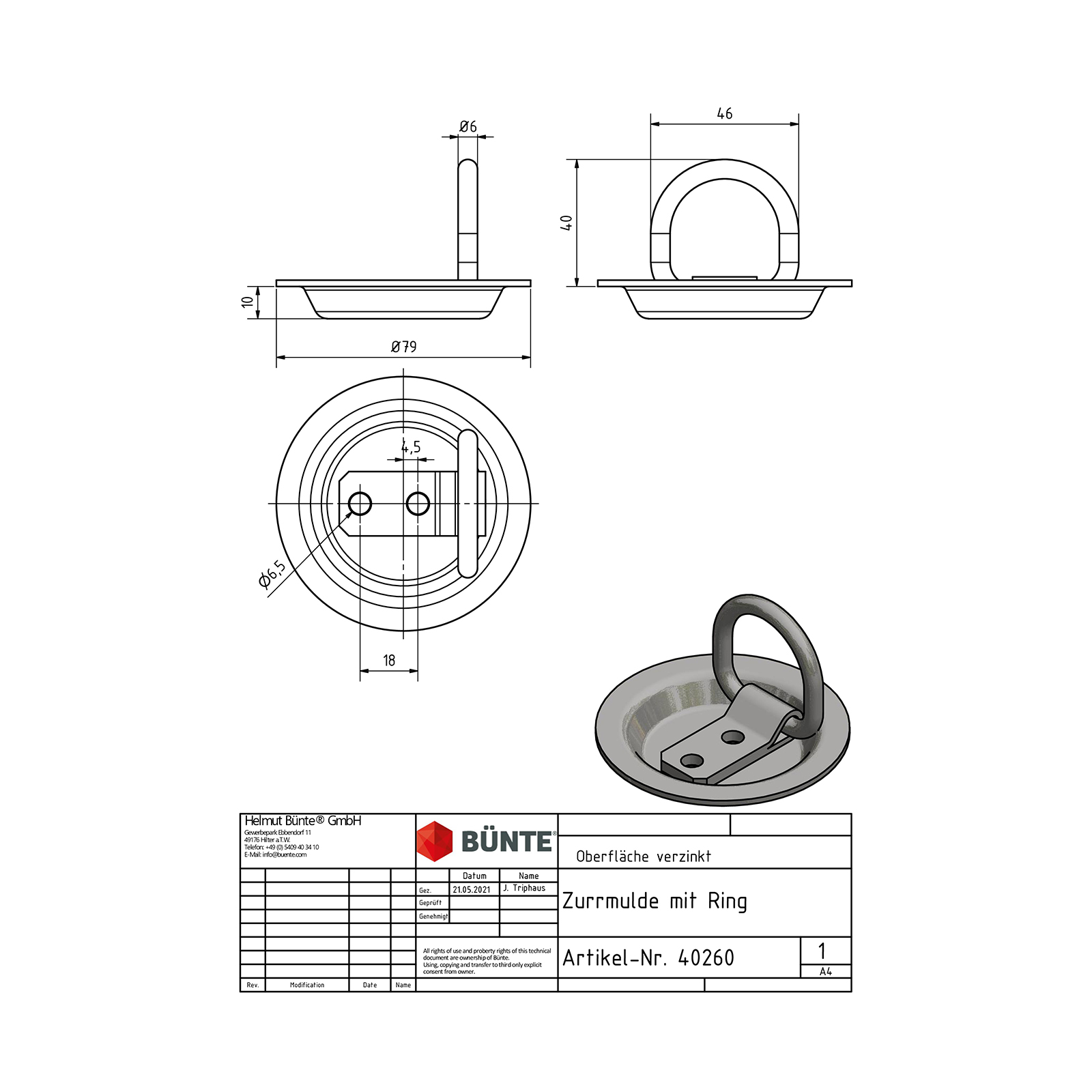 KNOTT Zurrmulde, rund, ⌀ 79 x 13 mm, mit Lasche/Ring, 250 daN, Stahl verzinkt