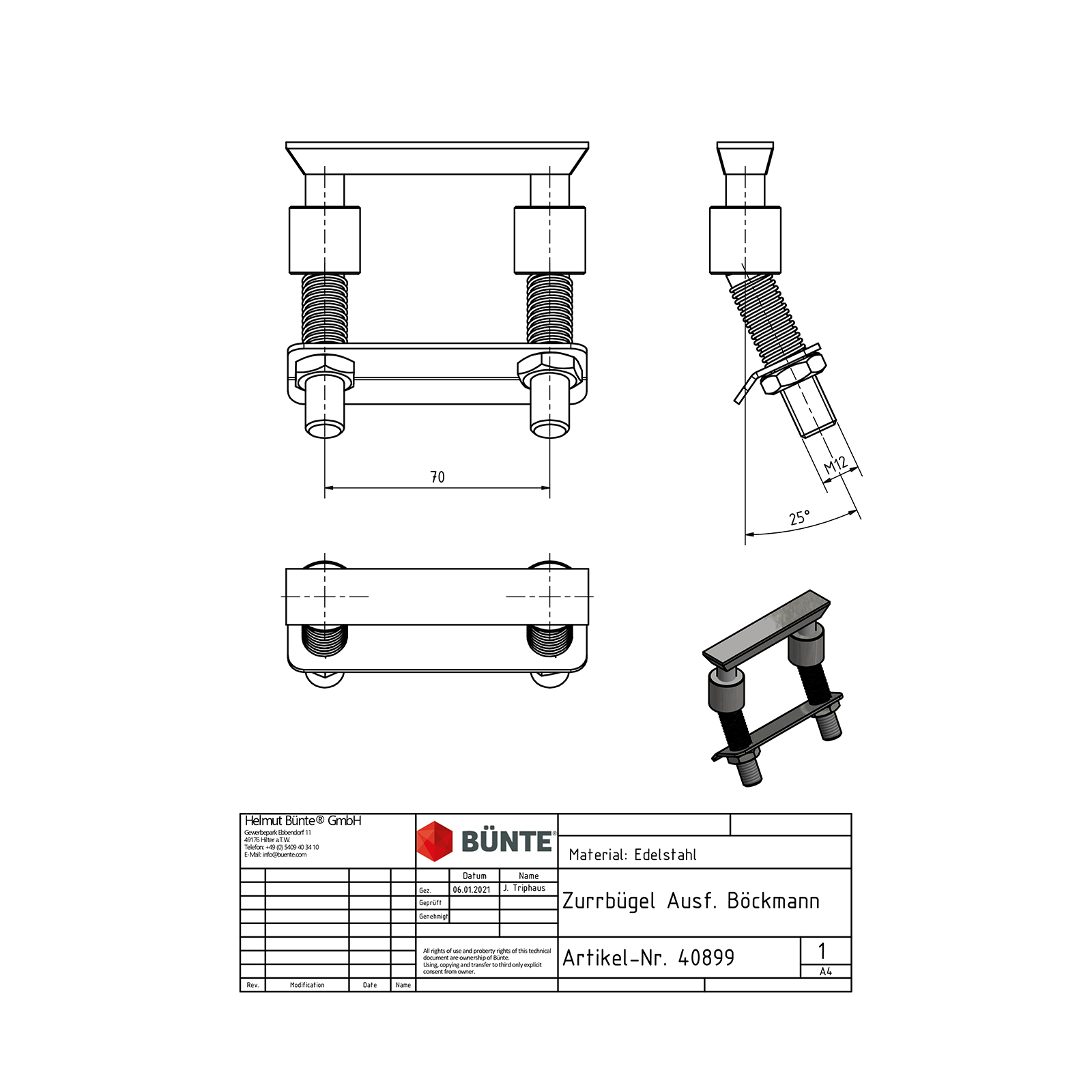 Zurrbügel, M12, 95 x 95 mm, 25° abgewinkelt, mit  Gegenplatte, Lochabstand 70 mm, 2 Federn,  2 Muttern M12, Nirosta, für BÖCKMANN