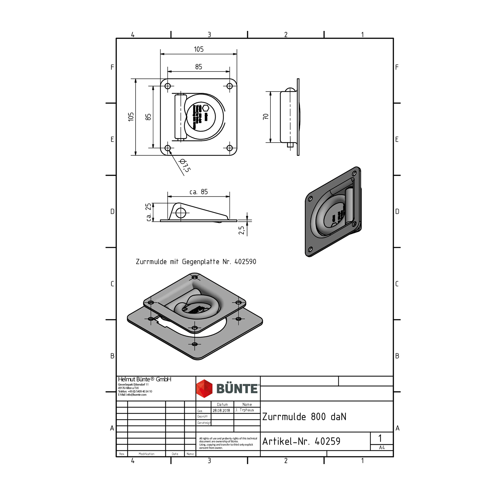 BÜNTE Zurrmulde, quadratisch, 105 x 105 x 25 mm mit Feder, 800 daN, Stahl verzinkt