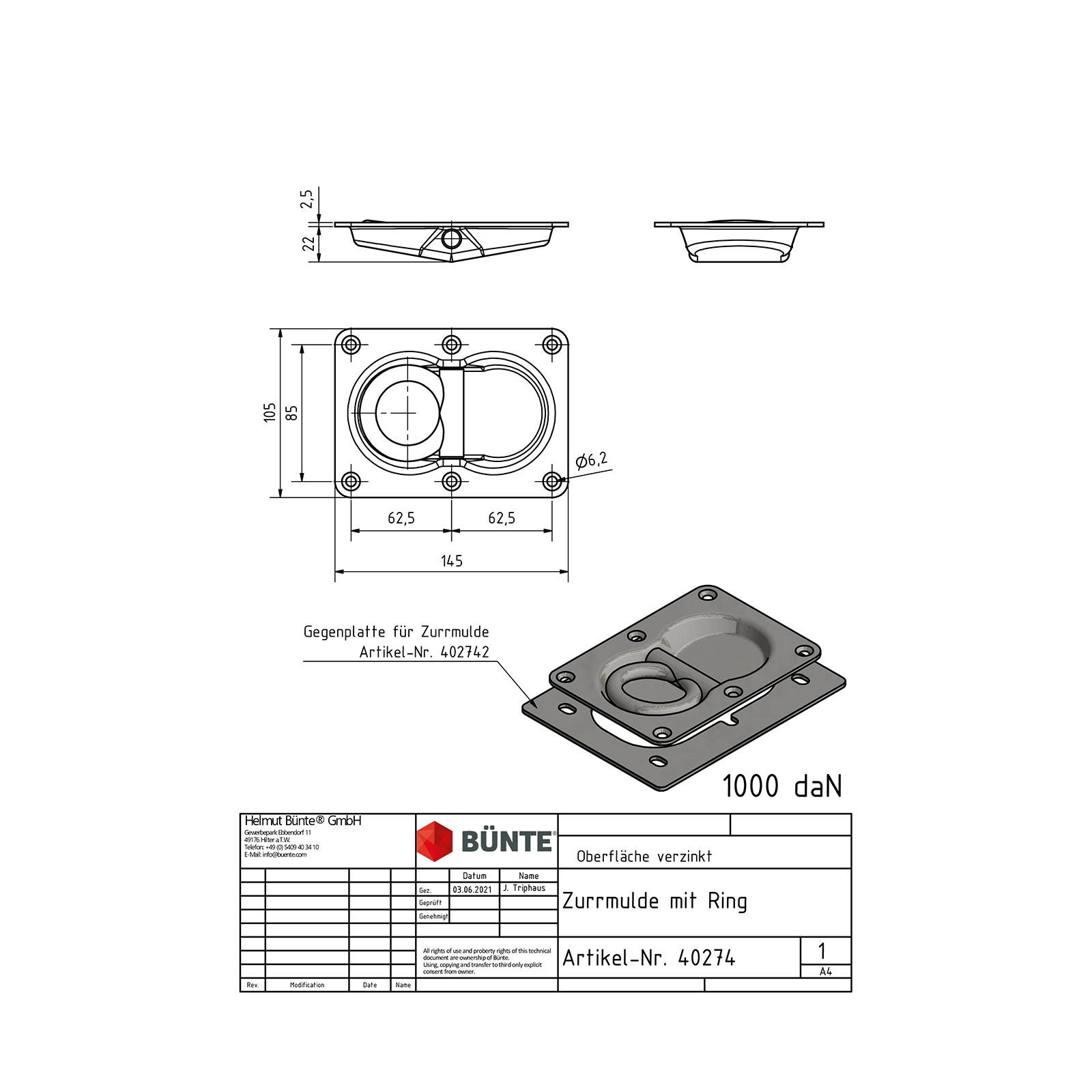 Zurrmulde, rechteckig, 105 x 145 x 24 mm, 1000 daN, Stahl verzinkt