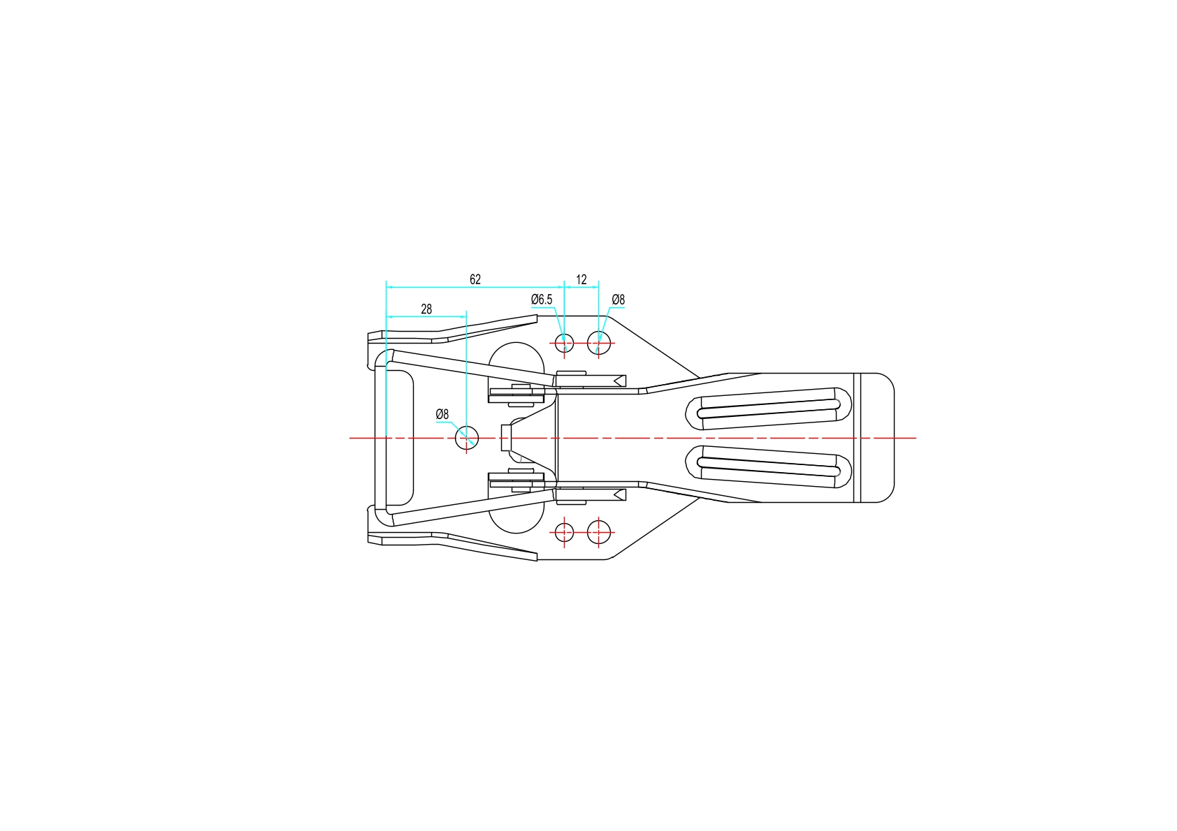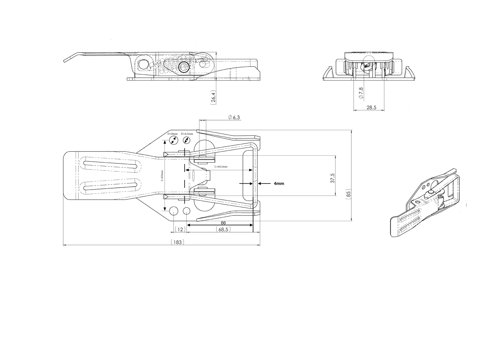 Exzenterverschluss, 85 x 183 x 26,4 mm,  Lochabstand 12/34/46/65 mm, Bohrungen ⌀ 6,5/8 mm, Stahl verzinkt