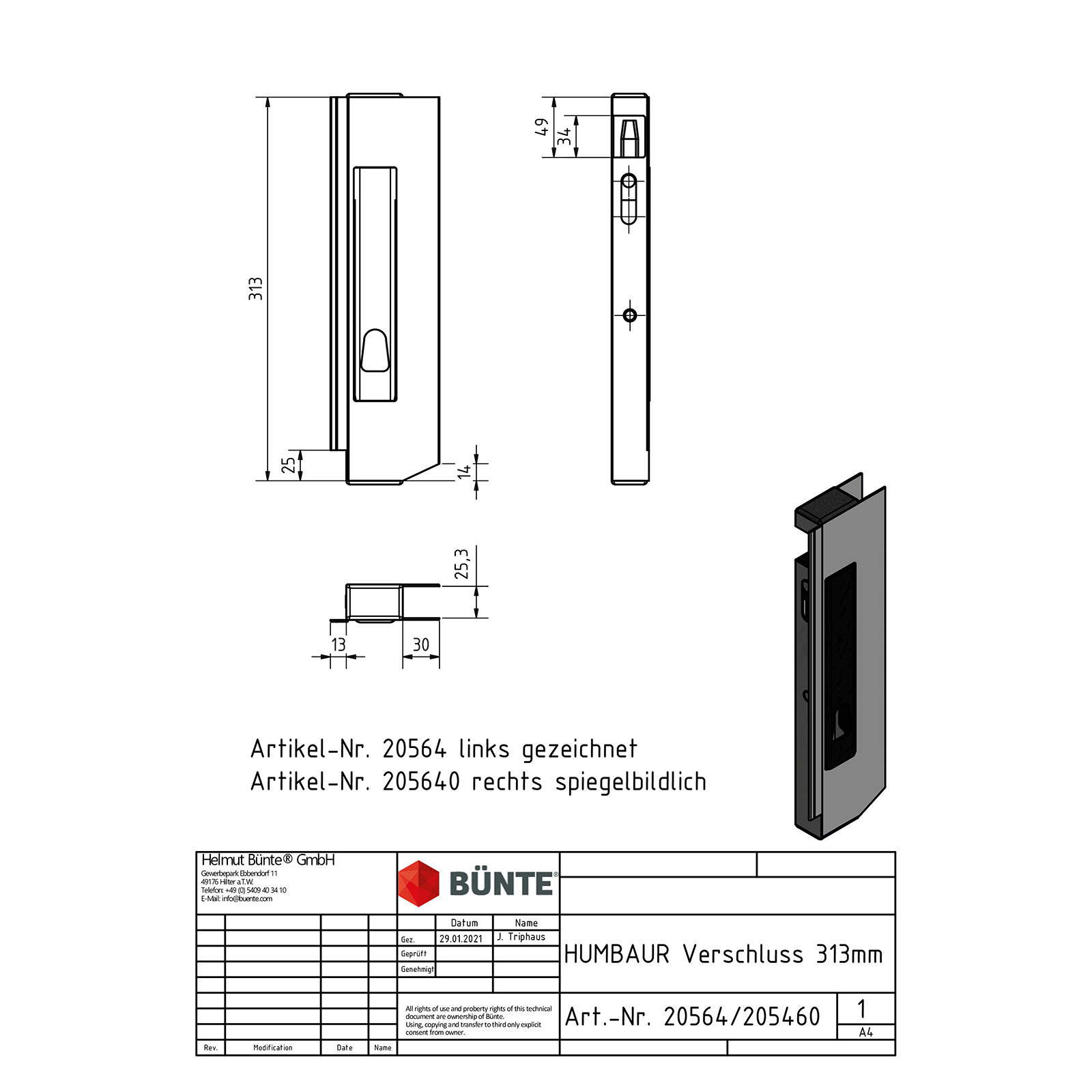 Aluminiumverschluss, links, 313 mm, GH unten, mit schwarzem Lochmetallgriff, 2 Kunststoffkappen, für 25 mm Bordwandprofil, für HUMBAUR