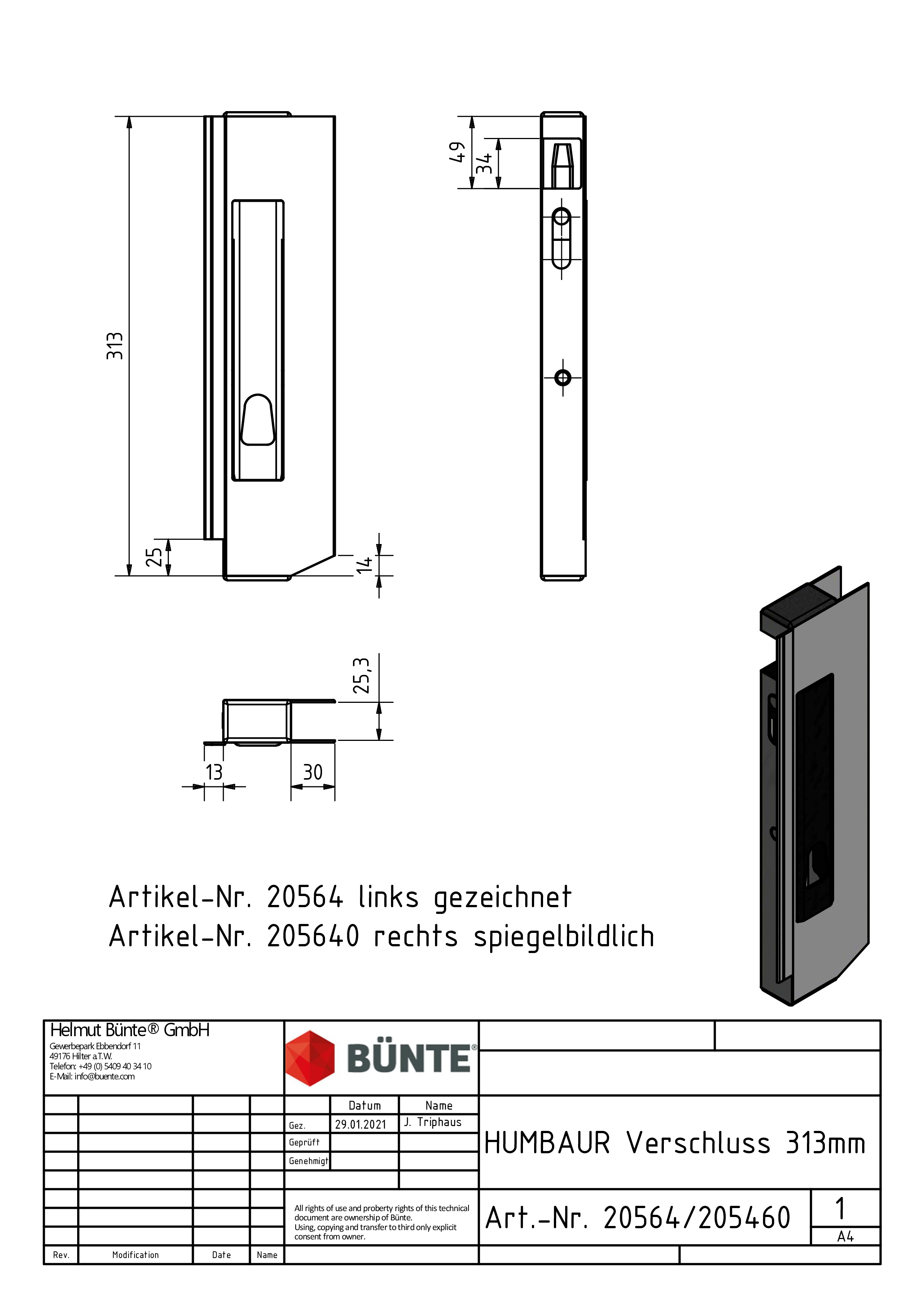 Aluminiumverschluss, rechts, 313 mm, GH unten, mit schwarzem Lochmetallgriff, 2 Kunststoffkappen, für 25 mm Bordwandprofil, für HUMBAUR