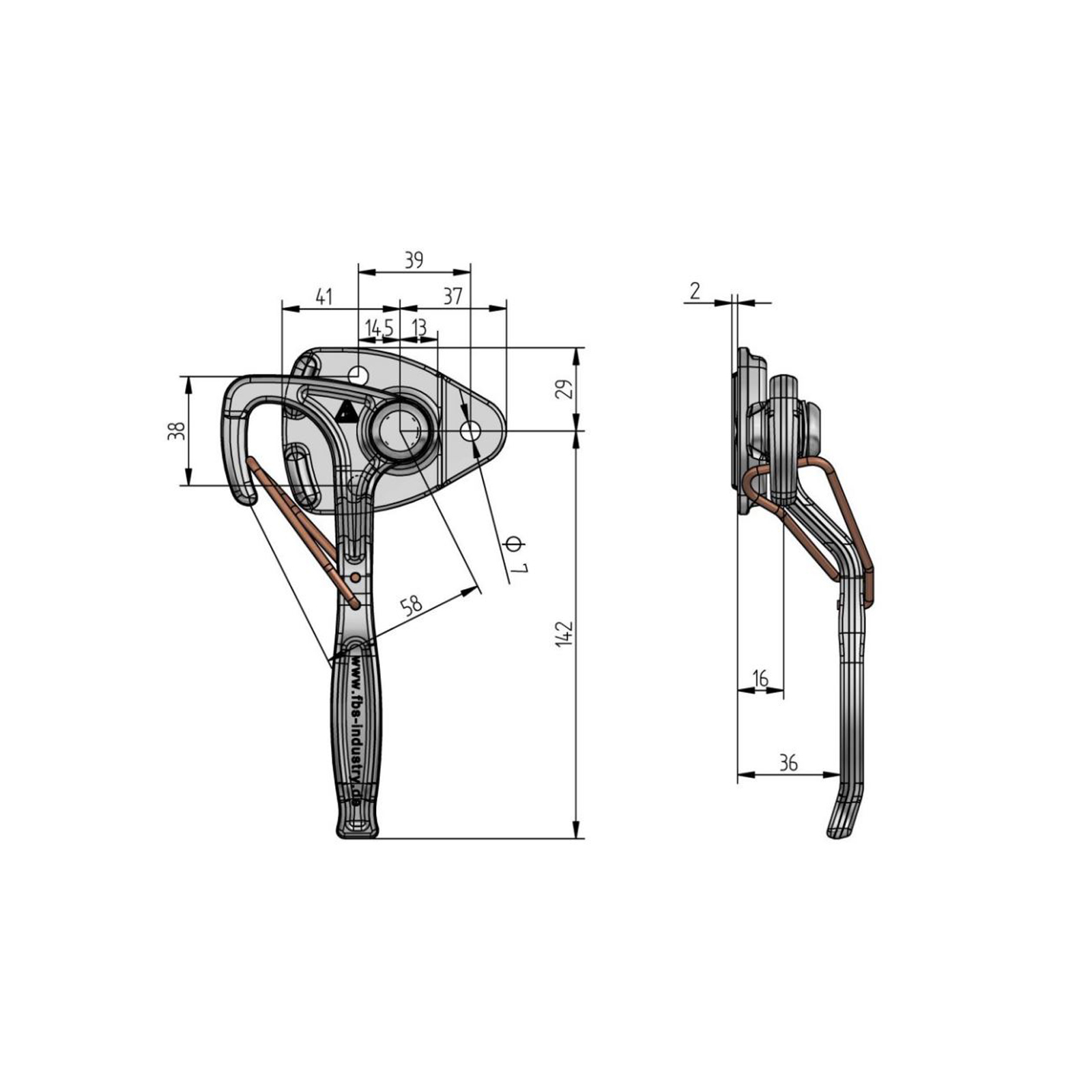 FBS Winkelhebelverschluss, rechts, Größe 0, mit  Federsicherung, Hebellänge 142 mm, Bohrungen  ⌀ 7 mm, Lochabstand 38/39 mm, Stahl verzinkt