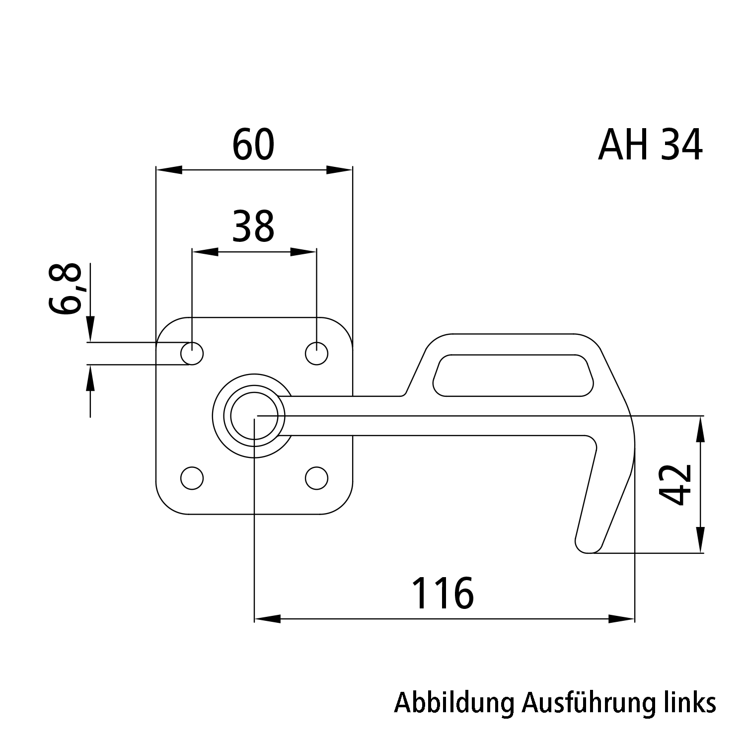 Kastenverschluss, links, Größe 0, Hebellänge   116 mm, Bohrungen ⌀ 6,8 mm, Lochabstand 38 mm, mit Bügelgriff, Stahl verzinkt