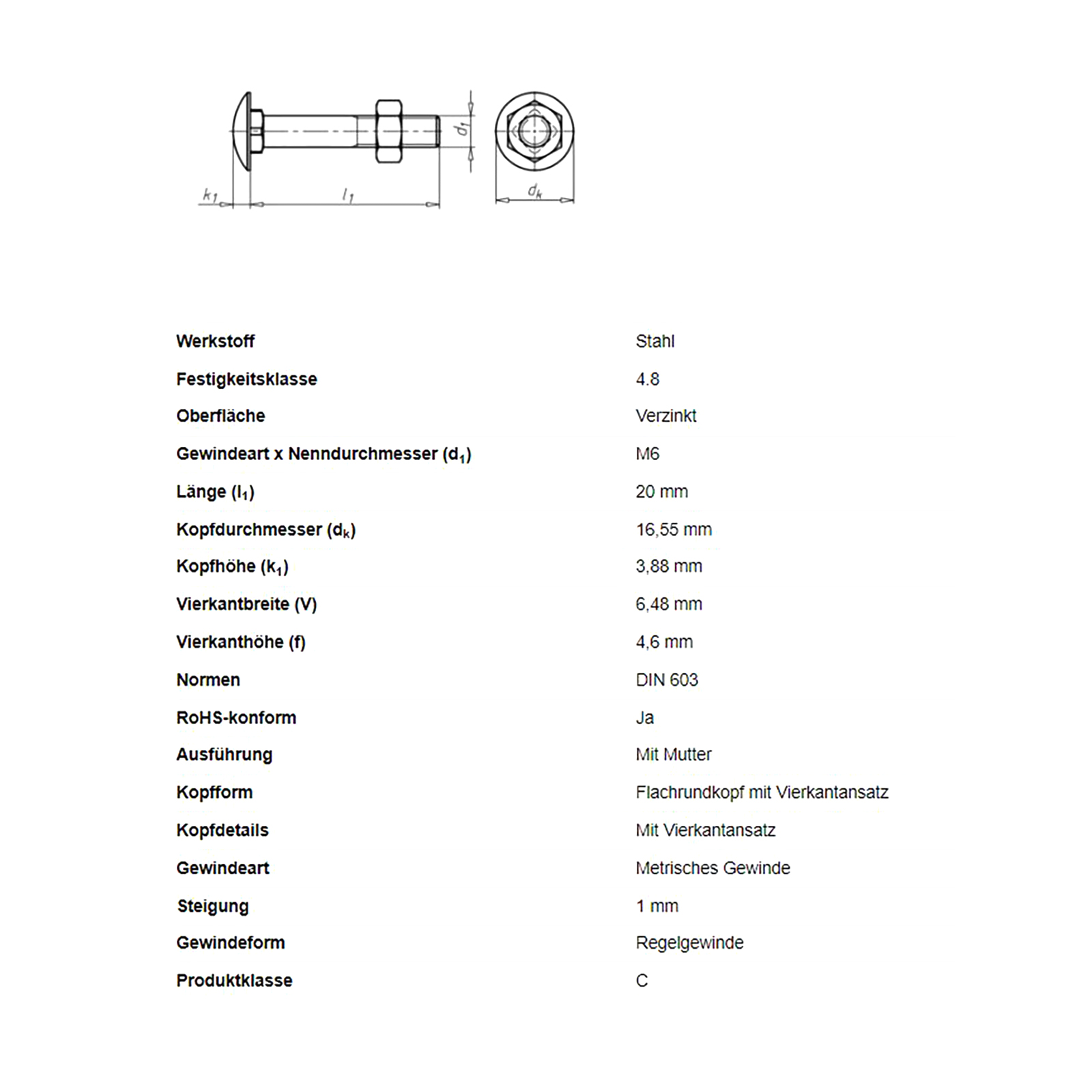 Flachrundschraube mit Vierkantansatz, M6 x 20 mm, mit Mutter, DIN 603, Festigkeitsklasse 4.8