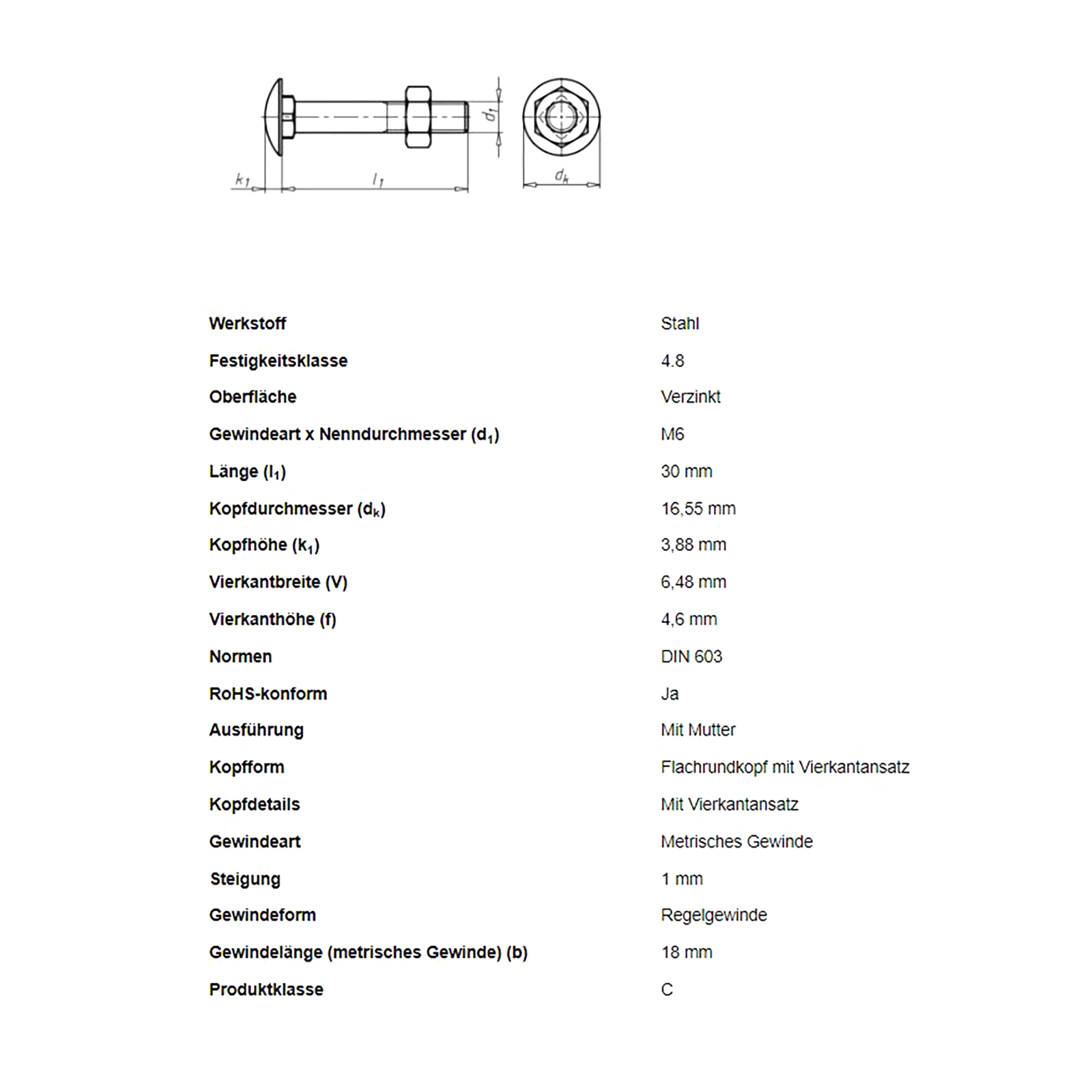 Flachrundschraube mit Vierkantansatz, M6 x 30 mm, mit Mutter, DIN 603, Festigkeitsklasse 4.8