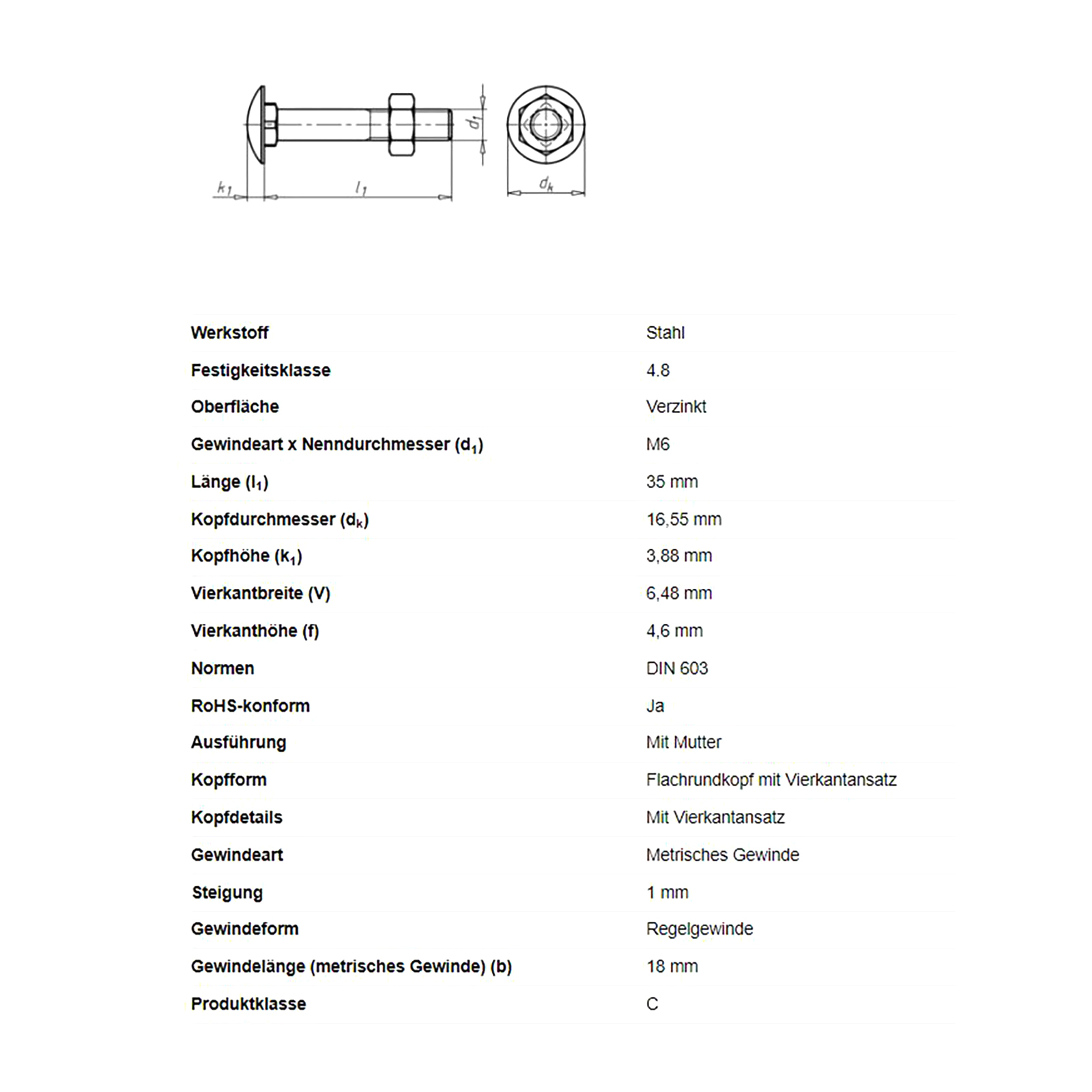 Flachrundschraube mit Vierkantansatz, M6 x 35 mm, mit Mutter, DIN 603, Festigkeitsklasse 4.8