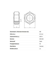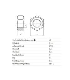 Sechskantmutter, M8 x 6,5 mm, Schlüsselweite 13 DIN 934, Fest...