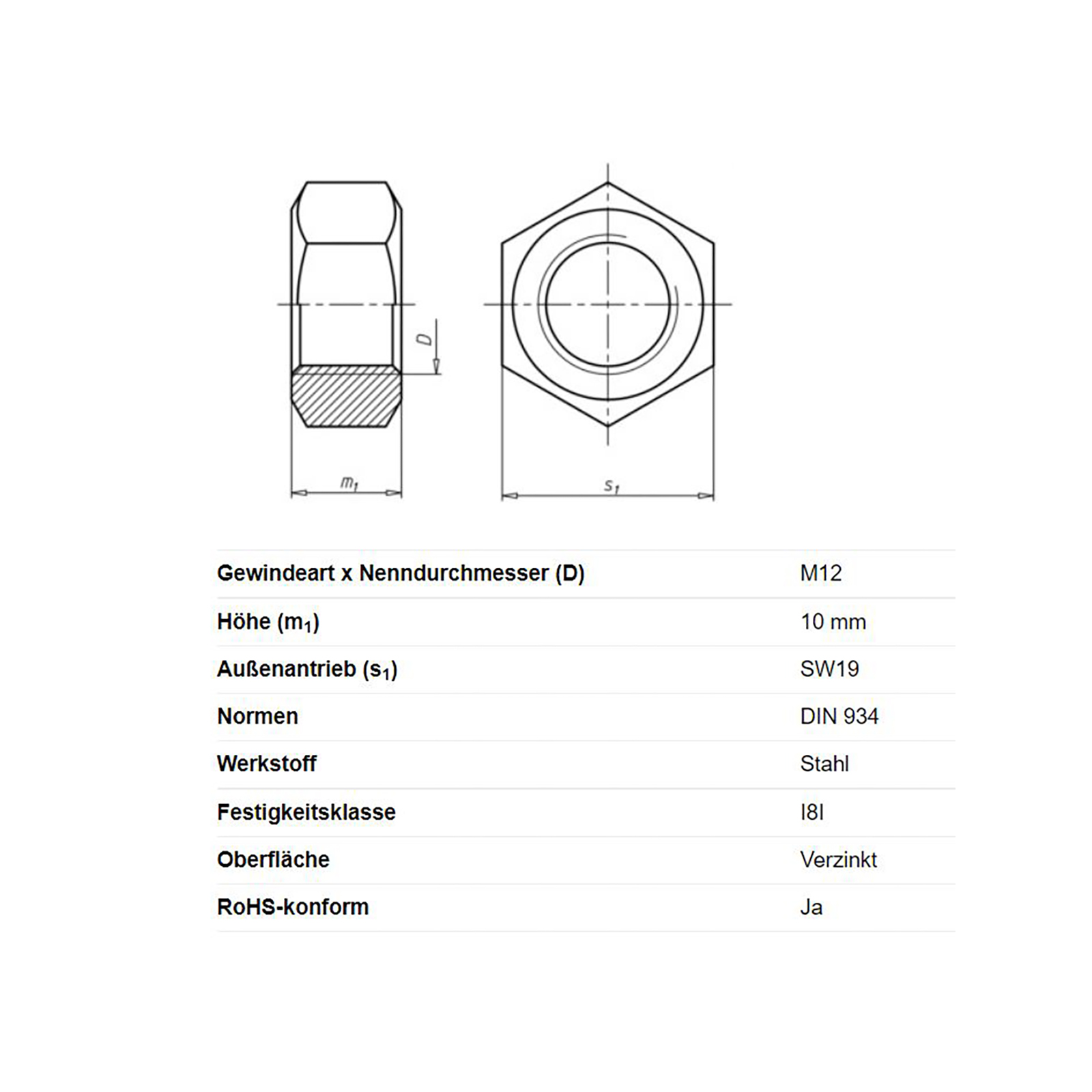 Sechskantmutter, M12 x 10 mm, Schlüsselweite 19, DIN 934, Festigkeitsklasse I8I