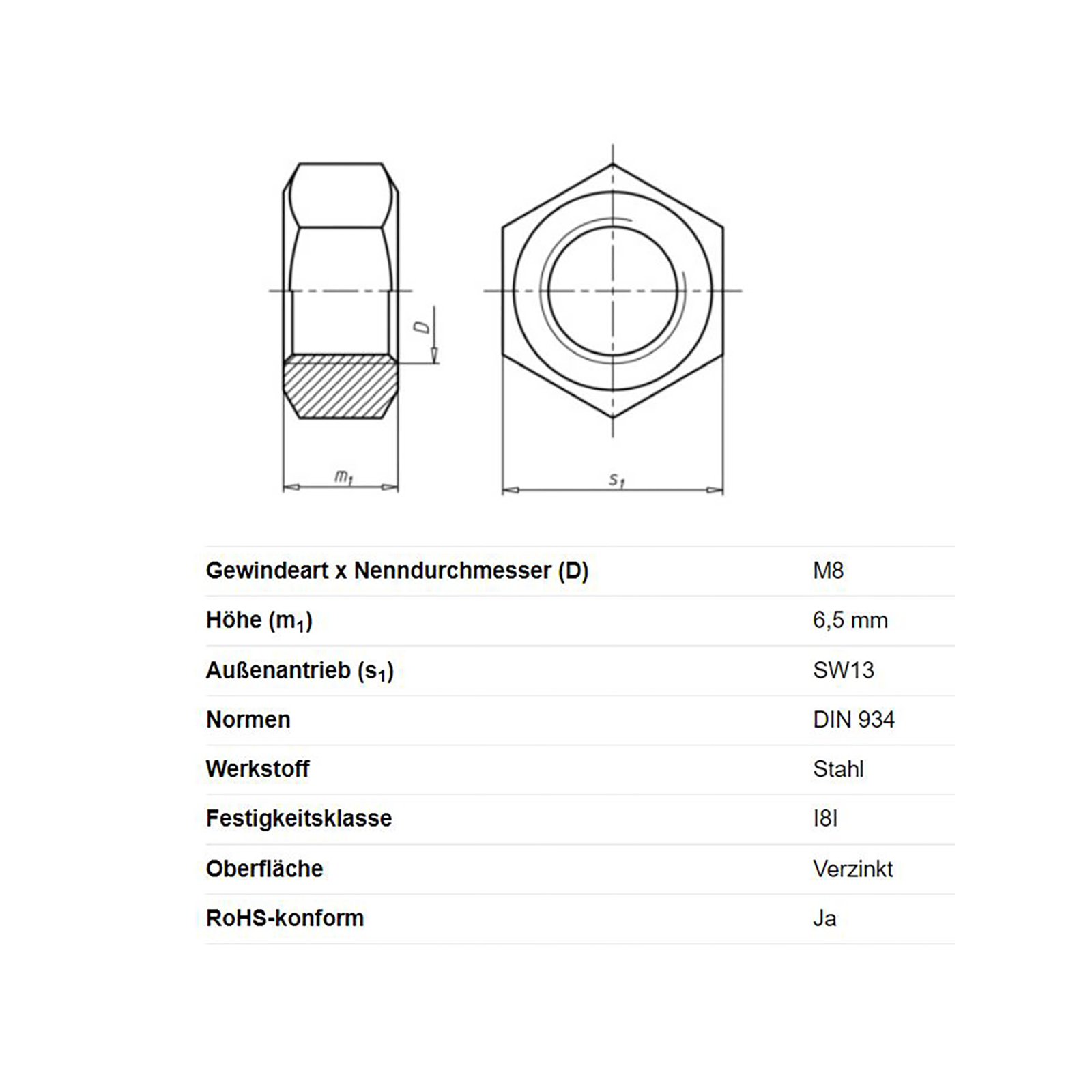 Sechskantmutter, M8 x 6,5 mm, Schlüsselweite 13, DIN 934, Festigkeitsklasse I8I