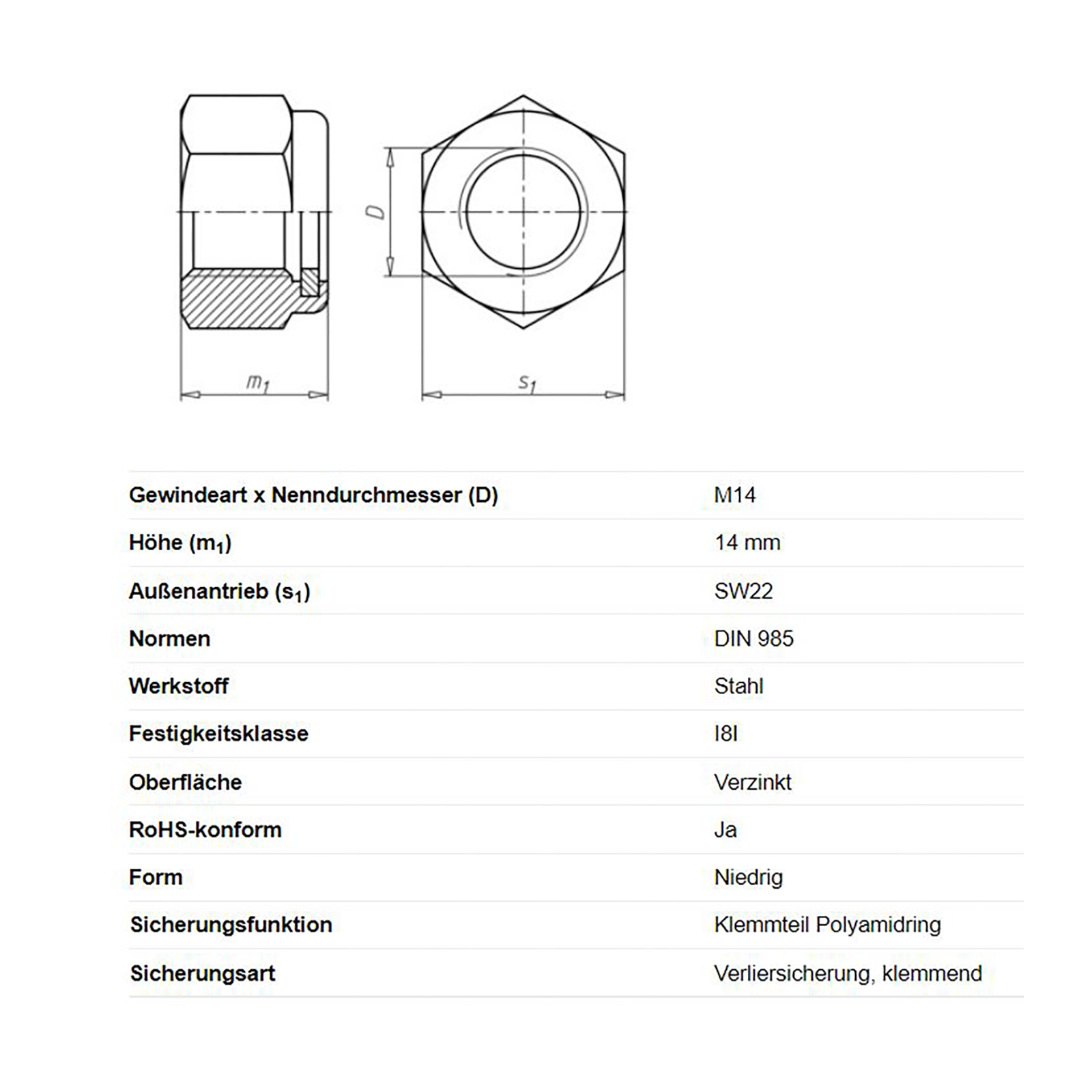 Sechskantmutter selbstsichernd, M14 x 14 mm, Schlüsselweite 22, DIN 985, Festigkeitsklasse I8I