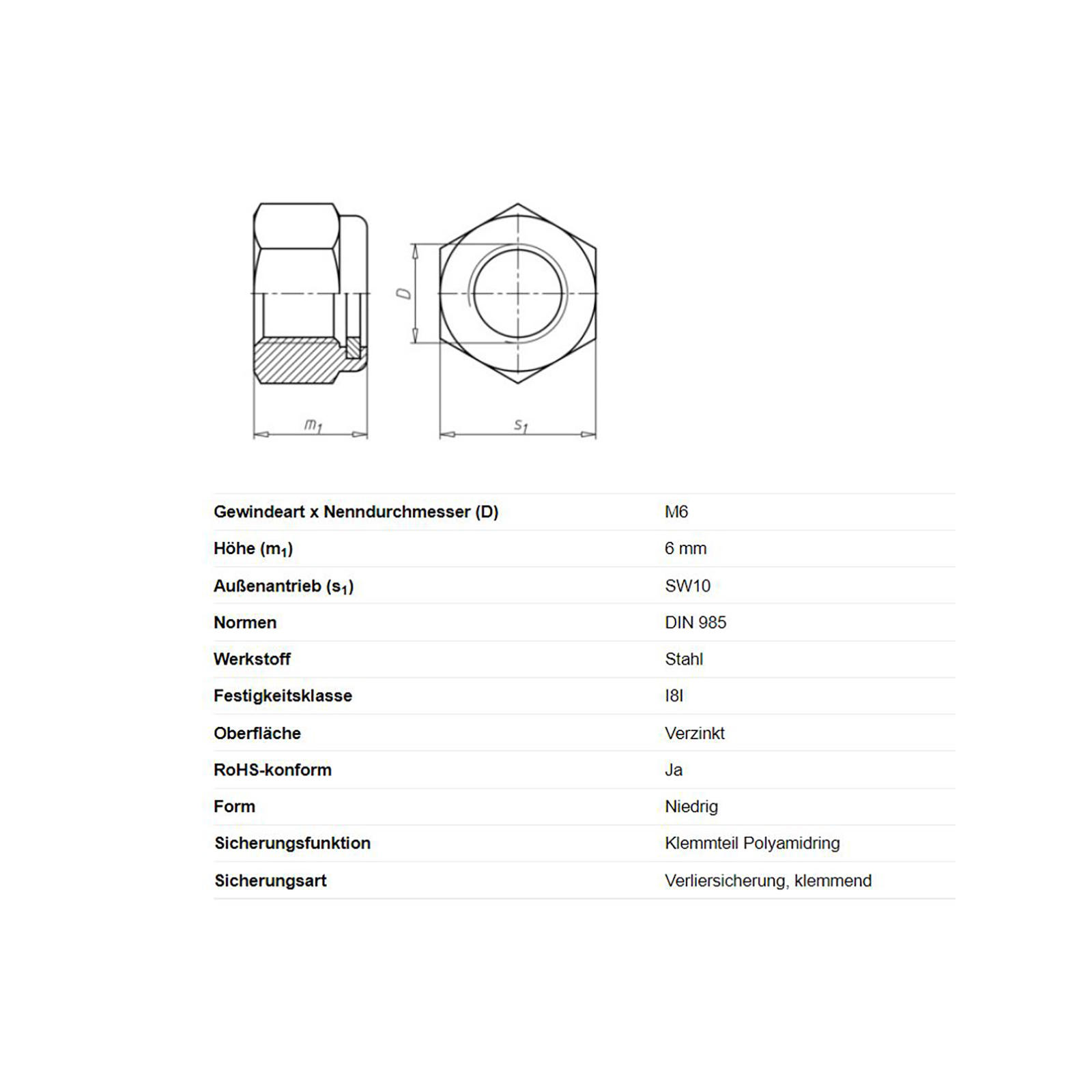 Sechskantmutter selbstsichernd, M6 x 6 mm, Schlüsselweite 10, DIN 985, Festigkeitsklasse I8I