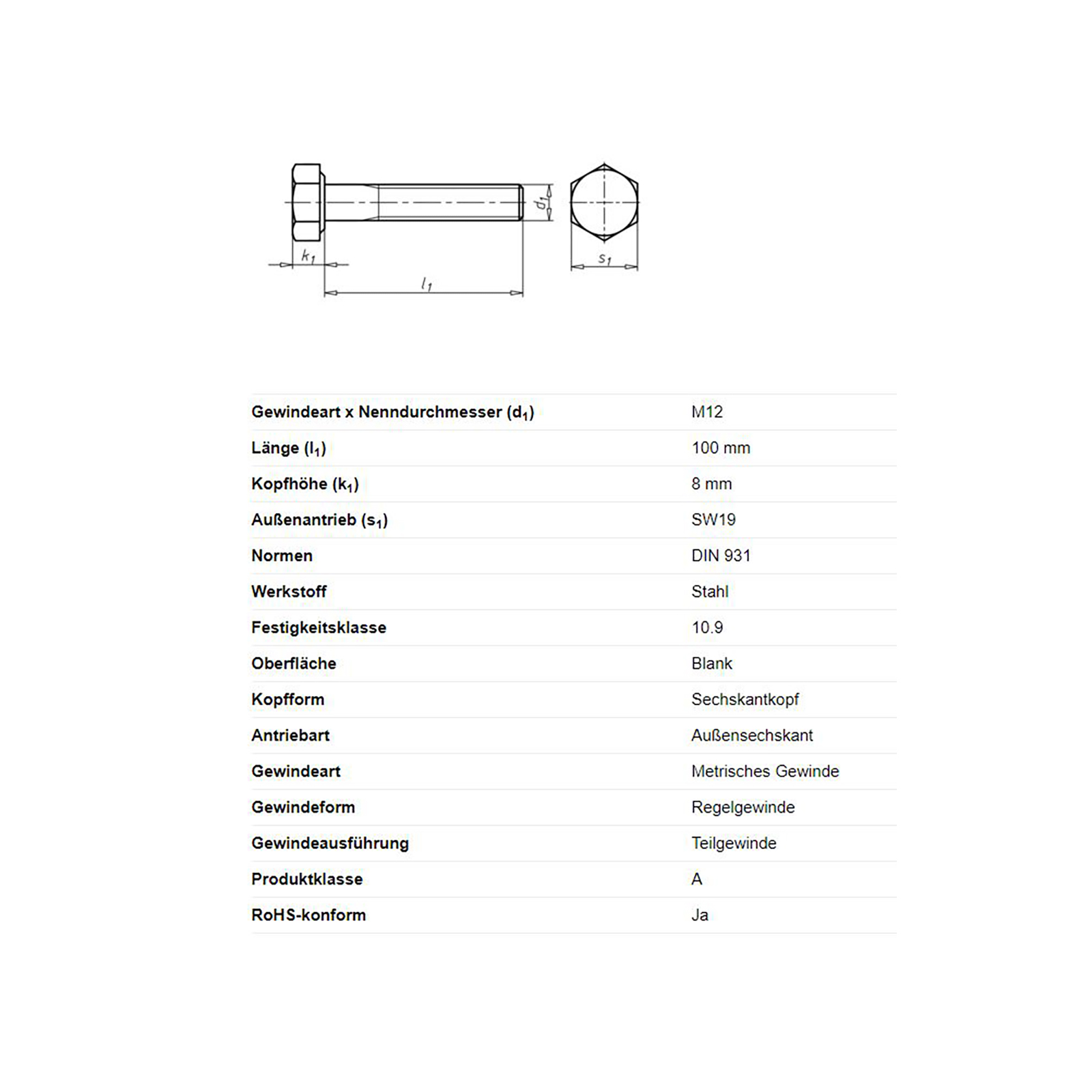 Sechskantschraube mit Schaft, M12 x 100 mm, Schlüsselweite 19, DIN 931, Festigkeitsklasse 10.9