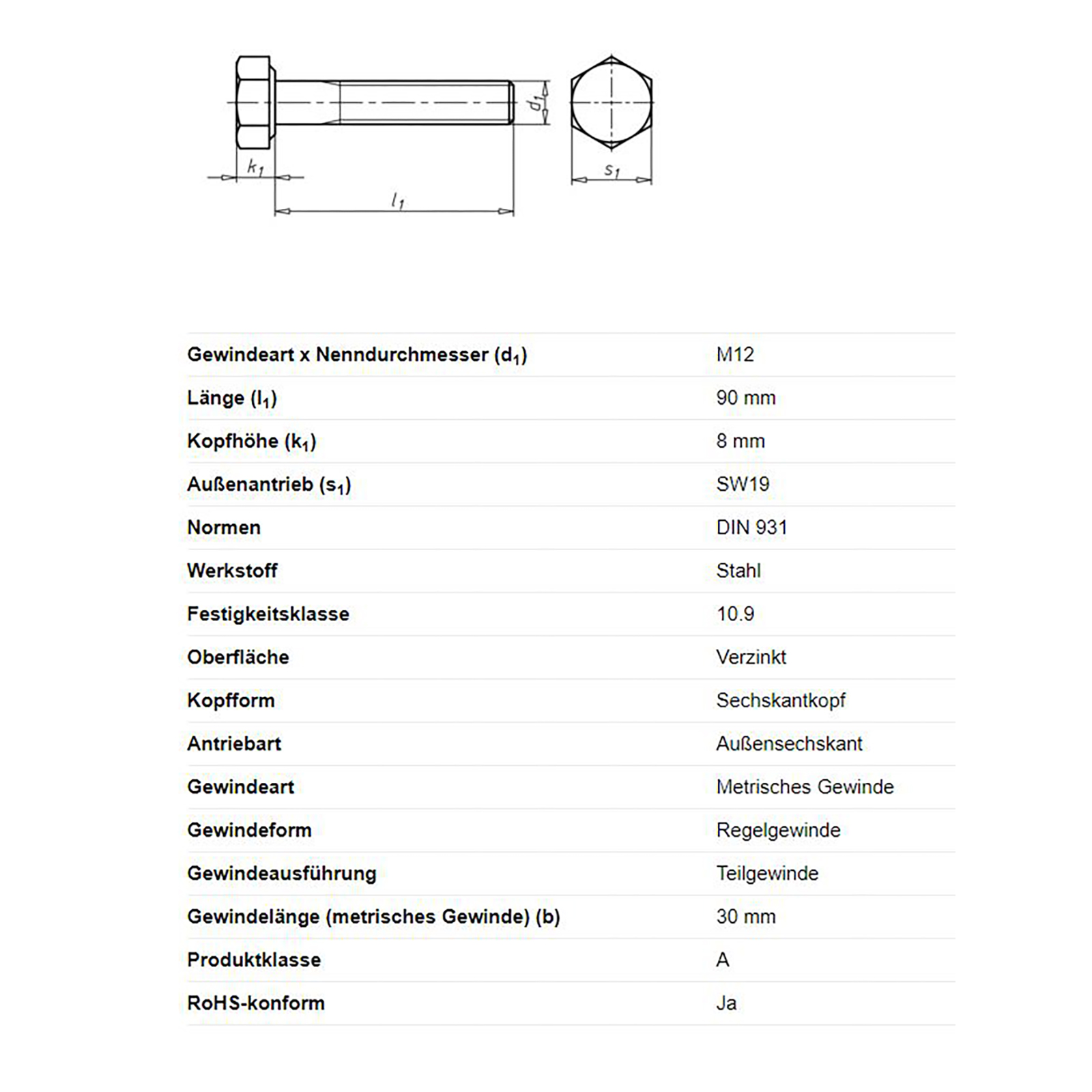 Sechskantschraube mit Schaft, M12 x 90 mm, Schlüsselweite 19, DIN 931, Festigkeitsklasse 10.9