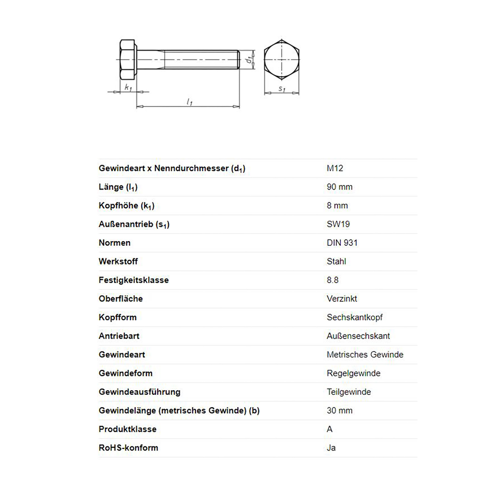 Sechskantschraube mit Schaft, M12 x 90 mm, Schlüsselweite 19, DIN 931, Festigkeitsklasse 8.8