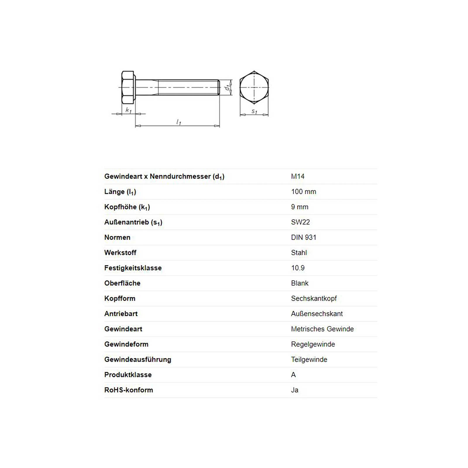Sechskantschraube mit Schaft, M14 x 100 mm, Schlüsselweite 22, DIN 931, Festigkeitsklasse 10.9