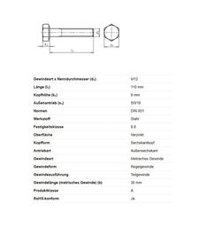Sechskantschraube m. Schaft, M12 x 110 mm Schlüsselweite 19, ...